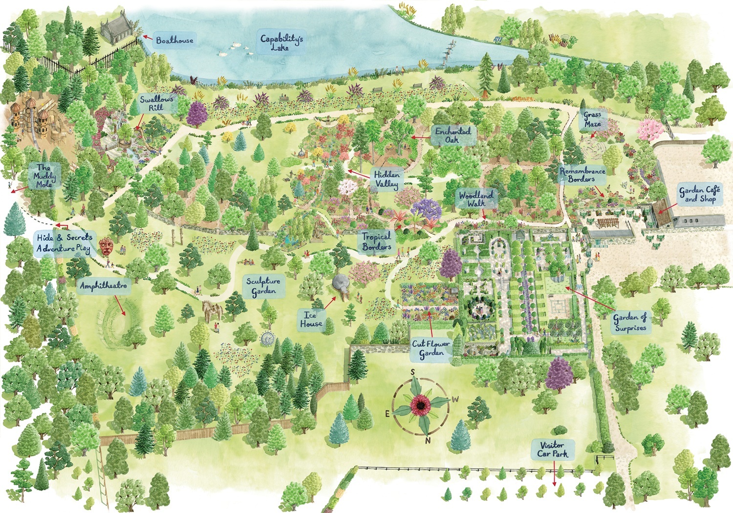 Ladies, Gents, Disabled Toilets and Baby Change facilities located in the Garden Café courtyard. Exit the gardens via the Ticket Desk kiosks to access the toilets.